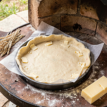 Przygotuj składniki i narzędzia: tartownicę lub żeliwną patelnię o średnicy 24 cm, nóż, deskę, miskę, twardą tarkę lub nóż do siekania masła, wałek do ciasta, papier do pieczenia. Włóż masło do lodówki aż będzie bardzo zimne (co najmniej 15 minut). Przesiej mąkę do dużej miski, dodaj cukier (50 g z podanej ilości), proszek do pieczenia i sól.