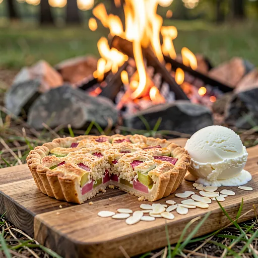 Rustykalna tarta z rabarbarem łącząca wiosenną kwaskowatość świeżych łodyg z maślanym, kruchym spodem. Przepis łączy tradycyjne polskie składniki (rabarbar, masło, mąka) z techniką pieczenia w ognisku — efekt to lekko dymny aromat i złocista, chrupiąca skórka. Doskonała na majówkę, piknik lub wieczorne spotkanie przy ognisku; świetnie komponuje się z lodami waniliowymi, kwaśną śmietanką lub łyżką gęstej maślanki. W przepisie znajdziesz dokładne, krok po kroku instrukcje jak przygotować kruche ciasto, macerować rabarbar, złożyć tartę i bezpiecznie upiec ją w żeliwnym naczyniu nad żarem ogniska. Danie ma wyrazisty kontrast słodko-kwaśny i apetyczny, rustykalny wygląd — po upieczeniu krawędzie są złociste, nadzienie delikatnie ścięte, a powierzchnia może mieć lekkie, karmelizowane plamy rabarbaru.