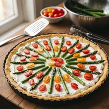 Ta elegancka i lekka tarta to kwintesencja wiosenno-letniej kuchni. Jej sercem jest kruche, maślane ciasto wzbogacone aromatem suszonych ziół, które stanowi idealny spód dla delikatnego, kremowego nadzienia z sera ricotta. Na wierzchu znajdziesz kompozycję ze świeżych, zielonych szparagów oraz słodkich, pieczonych pomidorków koktajlowych, które po upieczeniu uwalniają pełnię swojego smaku. Całość jest nie tylko pyszna, ale i niezwykle efektowna wizualnie, co czyni ją idealnym daniem na specjalne okazje, takie jak brunch, lekki obiad czy elegancka przystawka podczas spotkania z przyjaciółmi. Tarta smakuje wyśmienicie zarówno na ciepło, prosto z piekarnika, jak i w temperaturze pokojowej, podana z lekką sałatką z winegretem.