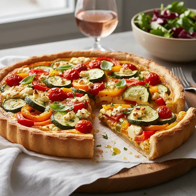 Elegancka i niezwykle smaczna tarta na kruchym, maślanym spodzie, wypełniona po brzegi kolorowymi, lekko podpieczonymi warzywami oraz kremową masą jajeczno-śmietanową z wyrazistym akcentem słonej fety. To danie, które zachwyca zarówno smakiem, jak i wyglądem. Połączenie chrupiącego ciasta, delikatnych warzyw (cukinii, papryki, pomidorków) i charakterystycznego sera tworzy harmonijną kompozycję idealną na specjalne okazje. Tarta jest doskonałym wyborem na sylwestrową kolację lub przyjęcie, ponieważ można ją przygotować z wyprzedzeniem i podawać zarówno na ciepło, jak i w temperaturze pokojowej. Pokrojona na mniejsze kawałki, sprawdzi się również jako wykwintna przystawka. Jej uniwersalność i bogactwo smaków sprawiają, że zadowoli nawet najbardziej wymagające podniebienia.
