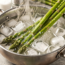 Przygotuj szparagi: odłam zdrewniałe końcówki (złamią się w naturalnym miejscu). Jeśli pędy są grube, obierz dolną połowę cienko obieraczką. Zagotuj duży garnek wody z 5 g soli. Wrzuć szparagi na wrzątek i gotuj 2-3 minuty (mają pozostać jędrne i intensywnie zielone). Natychmiast przełóż do miski z lodowatą wodą, żeby zatrzymać proces gotowania. Odsącz i osusz papierowym ręcznikiem. Przygotuj część na dekorację (szczyty) i opcjonalnie pokrój dłuższe pędy na kawałki do wnętrza.