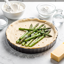 Wlej masę z ricotty do podpieczonego spodu i wyrównaj. Ułóż szparagi dekoracyjnie na wierzchu — najładniej wyglądają całe pędy lub ułożone wachlarzem. Opcjonalnie posyp startym serem żółtym dla ładniejszej, lekko złocistej skórki. Wstaw do piekarnika i piecz 25-30 minut, aż nadzienie się zetnie (środek będzie lekko jędrny, ale nie płynny) a wierzch lekko zarumieniony.