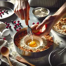 Zrób wgłębienie w środku kruszonki, wbij jajko i szybko wymieszaj widelcem najpierw środek, a potem stopniowo łącz z resztą mąki. Zbierz składniki rękoma i zagnieć krótko, aż masa połączy się w jednolite ciasto (ok. 1-2 minuty). Nie wyrabiaj zbyt długo — ciasto ma być zwarte i nie kleić się do rąk.