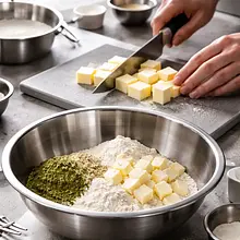 Schłodzone masło pokrój na małe kostki (ok. 1 cm). Dodaj do suchych składników i szybko, palcami lub używając siekacza do ciasta, wcieraj masło w mąki aż masa będzie przypominać gruboziarnistą bułkę tartą (małe grudki masła wielkości ziaren grochu).