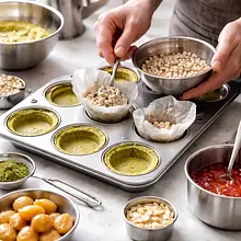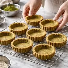 Przykryj spody papierem do pieczenia i wypełnij obciążeniem (suche fasole, groch lub ceramiczne kulki). Piecz w 180°C przez 12-15 minut aż brzegi staną się jasnozłote. Usuń obciążenie i papier, piecz dodatkowe 4-6 minut aż spody będą złociste i suche w dotyku.