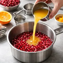 W rondelku połącz 120 g ziaren granatu (ok. połowa odłożona do dekoracji) z 80 ml soku pomarańczowego i 20 g cukru brązowego. Doprowadź do wrzenia, następnie zmniejsz ogień i gotuj 6-8 minut, aż sos lekko zgęstnieje. Odstaw 2-3 łyżki ziaren do dekoracji. Resztę przetrzyj przez sitko, aby otrzymać gładką, lśniącą glazurę. Jeśli sos jest zbyt kwaśny, dodaj do smaku 5-10 g cukru brązowego.
