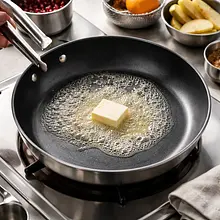 Rozgrzej patelnię nieprzywierającą (średnica 24-26 cm) na średnim ogniu. Dodaj 20 g masła i poczekaj aż się rozpuści (ok. 30 s). Włóż ćwiartki gruszki (300 g), posyp 20 g cukru brązowego i skrop 10 g soku z cytryny. Smaż 4-6 minut z jednej strony, aż pojawi się złoty karmel, następnie obróć i smaż kolejne 3-4 minuty aż gruszka zmięknie, ale nie rozpadnie się. Na koniec podnieś ogień na 30 s, aby karmel nabrał intensywnej barwy.