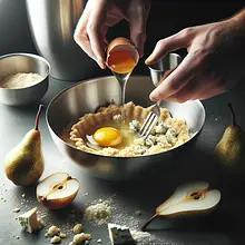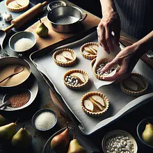 Delikatne francuskie tartaletki z kruchym spodem, kremowym nadzieniem z sera pleśniowego i karmelizowanymi gruszkami — idealna przystawka łącząca słoność sera z naturalną słodyczą owocu. Inspiracja kuchnią francuską: kontrasty smakowe (słony, słodki, lekko kwaśny) i różnorodność tekstur (krucha baza, aksamitne nadzienie, miękkie kawałki gruszki). Tartaletki znakomicie sprawdzą się na przyjęciach, kolacjach degustacyjnych czy jako elegancka przekąska przed daniem głównym. Podawać lekko ciepłe lub w temperaturze pokojowej, udekorowane roztopionym miodem i posiekanymi orzechami dla dodatkowego chrupania i aromatu. Wzrok przyciąga złocisty kolor karmelizowanych gruszek na tle białego kremu z niebieskawymi żyłkami sera pleśniowego.