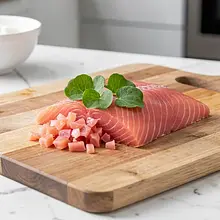 Użyj ostrego noża szefa (20 cm) i pęsety do ości. Deska plastikowa łatwiej dezynfekować. Krojenie włóż kilkukrotnie nożem w ruchach kontrolowanych — nie miażdż mięsa. Drobne kostki zapewnią jednolity smak i ładny wygląd.