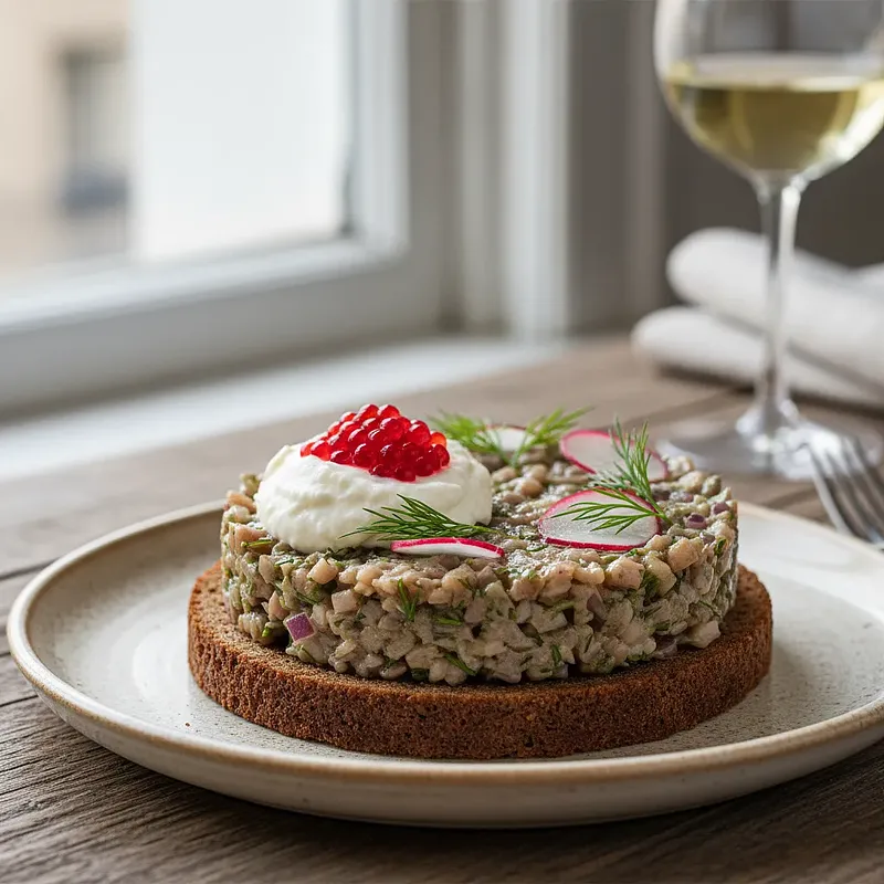 To wykwintna i nowoczesna przystawka, która czerpie inspirację z tradycyjnej polskiej kuchni wigilijnej. Klasyczny tatar ze śledzia zyskuje tu nowe oblicze dzięki podaniu na chrupiącym pumperniklu. Aksamitny mus chrzanowy dodaje delikatnej ostrości i kremowej konsystencji, idealnie równoważąc słony smak ryby. Prawdziwą gwiazdą jest jednak 'kawior' z buraka – małe, błyszczące perełki o słodko-ziemistym smaku, które nie tylko pięknie wyglądają, ale też dodają zaskakującego elementu tekstury i smaku. Danie jest niezwykle efektowne wizualnie, łącząc głęboki brąz pumpernikla, biel musu, srebrzystość śledzia i rubinową czerwień kawioru. Idealnie sprawdzi się jako elegancki starter na kolacji wigilijnej lub innym uroczystym przyjęciu, zachwycając gości zarówno smakiem, jak i wyglądem.