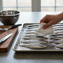 Filety śledziowe wyjmij z zalewy olejowej i osusz je bardzo dokładnie za pomocą ręcznika papierowego. To ważne, aby tatar nie był zbyt tłusty i wodnisty. Połóż filety na desce do krojenia i za pomocą ostrego noża pokrój je w bardzo drobną kostkę (tzw. brunoise), o boku około 3-4 mm. Im drobniej pokroisz składniki, tym lepsza będzie konsystencja tatara.