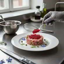 Elegancka i nowoczesna przystawka wigilijna, która łączy tradycyjne polskie smaki w zaskakującej formie. Delikatny, drobno siekany tatar ze śledzia matias, doprawiony kwaśnym jabłkiem, korniszonem i czerwoną cebulą, spoczywa na krążku intensywnego w smaku pumpernikla. Całość dopełnia aksamitny mus z serka śmietankowego z ostrym chrzanem, a wizualnym i smakowym zwieńczeniem jest domowy 'kawior' z soku z buraka. Danie charakteryzuje się złożonym profilem smakowym: słoność śledzia równoważy słodycz pumpernikla i ziemistość buraka, a ostrość chrzanu przełamuje kremowość serka. To idealna propozycja na rozpoczęcie uroczystej kolacji wigilijnej, która zachwyci gości zarówno smakiem, jak i wyrafinowanym wyglądem, przypominającym małe dzieła sztuki kulinarnej.