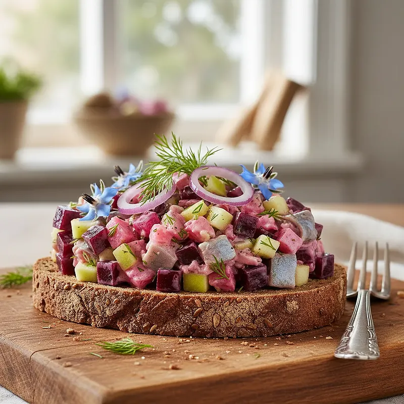 Tatar ze śledzia z burakiem i jabłkiem to nowoczesna i niezwykle elegancka interpretacja tradycyjnej polskiej przystawki wigilijnej. Danie łączy w sobie słony, charakterystyczny smak śledzi a'la matias ze słodyczą pieczonego buraka, orzeźwiającą kwasowością chrupiącego jabłka oraz ostrością czerwonej cebuli i korniszonów. Wszystkie składniki są krojone w drobną kostkę, co tworzy piękną, mozaikową strukturę, a całość spaja delikatny sos na bazie oleju rzepakowego i musztardy Dijon. Podany na kromkach ciemnego, lekko słodkawego pumpernikla, tatar nie tylko zachwyca złożonością smaków, ale również prezentuje się zjawiskowo na świątecznym stole. Jego intensywna, rubinowa barwa, przełamana bielą śledzia i zielenią koperku, stanowi piękną dekorację i zapowiedź wigilijnej uczty. To idealna propozycja na rozpoczęcie kolacji, lekka, pobudzająca apetyt i wprowadzająca w świąteczny nastrój.