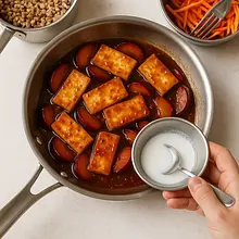 Gdy wszystkie porcje tofu są już złociste, zmniejsz ogień pod patelnią do średniego poziomu. Wlej przygotowaną glazurę śliwkową na patelnię z tofu — około 4–6 łyżek na partię, w zależności od ilości. Smaż 1–2 minuty, delikatnie mieszając, aż glazura zgęstnieje i równomiernie oblepi kawałki tofu. Sprawdź smak: jeśli za mało słone, dodaj odrobinę sosu sojowego; jeśli za kwaśne — trochę syropu klonowego.