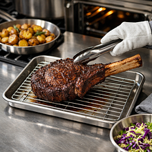 Po zbrązowieniu przełóż stek na deskę i odczekaj 8–10 minut przed krojeniem — dzięki temu soki równomiernie rozłożą się po mięsie. Krojąc, trzymaj nóż ukośnie do włókien mięśni (pod kątem 45°), aby plastry były miękkie. Jeśli tomahawk jest duży, możesz najpierw odciąć mięso od kości, a następnie pokroić w plastry grubości ok. 1 cm.