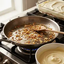 Na suchej, dużej patelni rozgrzanej na średniej mocy, umieść 100g wiórków kokosowych i 100g migdałów. Praż je przez 3-5 minut, ciągle mieszając drewnianą łyżką, aż staną się lekko złociste i zaczną intensywnie pachnieć. Uważaj, aby ich nie przypalić, bo staną się gorzkie. Przesyp od razu na zimny talerz, aby zatrzymać proces prażenia.