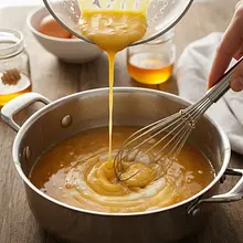 Bardzo powoli, cienką strużką, wlewaj roztrzepane jajka do gorącej masy miodowej, cały czas energicznie mieszając trzepaczką. To bardzo ważny moment - ciągłe mieszanie zapobiegnie ścięciu się jajek i powstaniu jajecznicy. Mieszaj jeszcze przez około 1-2 minuty, aż masa lekko zgęstnieje.