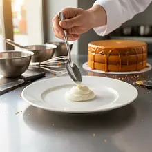 Tort 'Spartak' w wersji 'Karmelowa Noc' to wyrafinowana interpretacja klasycznego wschodnioeuropejskiego ciasta miodowego. Składa się z ośmiu niezwykle cienkich, intensywnie czekoladowych blatów, których głęboki smak zawdzięczają dodatkowi prawdziwego miodu i kakao najwyższej jakości. Blaty, po upieczeniu kruche, pod wpływem kremu stają się cudownie miękkie i wilgotne, tworząc harmonijną całość. Przełamaniem dla wytrawnych placków jest aksamitny, lekko słodki krem na bazie serka mascarpone i mleka skondensowanego, z subtelną nutą kawy i rumu, która dodaje deserowi elegancji. Całość wieńczy lśniąca polewa z gorzkiej czekolady, spływająca apetycznie po bokach. Tort prezentuje się zjawiskowo, a jego przekrój w czarno-białe pasy jest niezwykle efektowny. Idealny na specjalne okazje, kiedy chcemy zaimponować gościom deserem o złożonym, wielowymiarowym smaku.