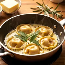 Ułóż tortelloni na podgrzanych talerzach, polej pozostałym masłem i szałwią z patelni. Opcjonalnie posyp 50 g startego parmezanu i skrop odrobiną świeżo zmielonego pieprzu. Dekoruj kilkoma listkami szałwii usmażonymi na chrupko.