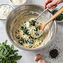Wyjmij tortelloni łyżką cedzakową bezpośrednio z garnka do patelni z masłem i szałwią. Delikatnie potrząśnij patelnią lub mieszaj drewnianą łyżką przez 1 minutę, aby makarony pokryły się sosem. Dopraw szczyptą soli i 2 g pieprzu czarnego do smaku.