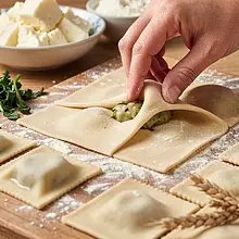 Rozwałkuj ciasto cienko (do około 1-2 mm) na lekko posypanej mąką powierzchni. Jeśli masz maszynkę do makaronu, przelej przez najgrubsze ustawienie, potem stopniowo na cieńsze do uzyskania 1-2 mm. Wycinaj kwadraty o boku około 6-7 cm.