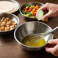 Przygotuj marynatę: w dużej misce wymieszaj 30 g oleju rzepakowego, sok z połowy limonki (ok. 15–20 g soku), 5 g papryki wędzonej, 5 g kminu rzymskiego, 2 g pieprzu i 4 g soli oraz drobno posiekany czosnek (10 g). Włóż pokrojone paski kurczaka do miski i dokładnie obtocz mięso w marynacie — użyj ręki lub dwóch łyżek, aby każdy pasek był równomiernie pokryty. Odstaw na 5–10 minut, aby przyprawy przeszły w mięso.