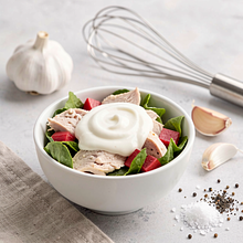Przygotuj sos kefirowy: do małej miseczki wlej 120 ml kefiru, dodaj 10 g drobno posiekanego lub przeciśniętego czosnku, szczyptę soli (ok. 1 g) i świeżo zmielony pieprz (do smaku). Wymieszaj widelcem do uzyskania jednolitej, kremowej konsystencji.