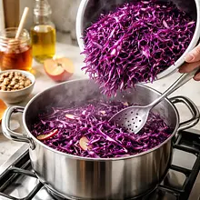 Delikatna, aromatyczna duszona czerwona kapusta z dodatkiem kwaśnych jabłek, miodu i octu balsamicznego — klasyczny zimowy dodatek kuchni środkowoeuropejskiej. Danie łączy słodycz miodu i jabłek z subtelną kwasowością octu oraz korzennymi nutami goździka i liścia laurowego. Świetnie komponuje się z pieczonym mięsem, kluskami, ziemniakami oraz jako element świątecznego stołu. Wizualnie przyciąga intensywną, rubinową barwą i błyszczącą glazurą; tekstura powinna być miękka, lecz z lekkim 'ząbem' — nie rozpadająca się całkowicie. To propozycja sezonowa, idealna na styczeń, która zachwyci zarówno smakiem, jak i aromatem.