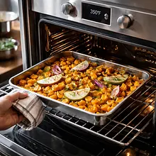 Użyj metalowej łopatki do przewracania. Jeśli krawędzie dyni są matowe i miękkie bez rumienienia, piekarnik może być za chłodny — zwiększ temperaturę o 10°C na ostatnie 5–7 minut.