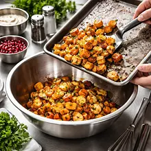 Wstaw blachę do nagrzanego piekarnika i piecz 30-40 minut, przewracając warzywa raz w połowie czasu (ok. po 15-20 minutach). Piecz do momentu, gdy warzywa będą miękkie przy nakłuciu widelcem i zaczną się lekko karmelizować na brzegach — marchew i pietruszka powinny mieć złoto-brązowe skórki, seler miękki w środku, a burak cienko karmelizowany.