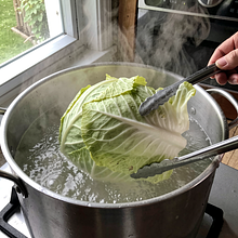 Użyj dużego garnka (min. 6 l) i długich szczypiec. Jeśli liście nie odchodzą łatwo, ponakłuwaj głąb nożem i gotuj kolejne 3-4 minuty. Nie gotuj zanadto — liście mają być elastyczne, nie rozgotowane.