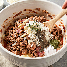 Użyj dużej miski i drewnianej łyżki lub rąk (umytych). Nie wyrabiaj zbyt długo — wystarczy, że składniki się połączą. Jeśli farsz jest zbyt rzadki, dodaj 1-2 łyżki ugotowanego ryżu.