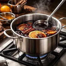 Przed podaniem podgrzej przecedzone grzane wino na bardzo małym ogniu do temperatury serwowania 60–65°C (ok. 3–5 minut). Napój powinien być gorący, parujący, ale nie wrzący — w tej temperaturze aromaty są najlepiej wyczuwalne, a alkohol się nie ulotni całkowicie.
