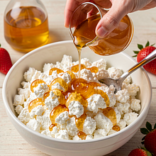 Prosty, klasyczny deser inspirowany polską kuchnią wiejską: kremowy twaróg podany z naturalnym miodem i sezonowymi truskawkami. To szybkie, świeże i aromatyczne połączenie łączy delikatną kwaskowość twarogu z słodyczą miodu oraz soczystością truskawek. Idealny jako lekki podwieczorek, deser po obiedzie lub przekąska dla gości. Wizualnie danie ma kontrast bieli twarogu, bursztynowych smug miodu i czerwieni owoców, a chrupiące orzechy włoskie (opcjonalnie) dodają tekstury.