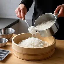Przełóż gorący ryż do szerokiej nie-metalowej miski (drewniana misa hangiri lub szeroka miska szklana). Wlej równomiernie przygotowaną mieszankę octu na powierzchnię ryżu. Używając drewnianej łopatki (shamoji) lub dużej szerokiej łyżki, delikatnie 'składaj' ryż: przeciągaj łopatką od spodu na wierzch, obracając miskę, aby nie ugniatać ziaren — technika składania zachowuje oddzielne, lśniące ziarenka. W tym samym czasie wachluj ryż (ręcznym wachlarzem lub kartką) aby szybciej go schłodzić do temperatury zbliżonej do temperatury pokojowej (około 30°C). Ryż jest gotowy, gdy jest lepki, lśniący i ziarna są rozdzielone (nie papkowate).