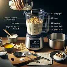 Do kielicha blendera włóż odsączone nerkowce, 400 g jogurtu sojowego, 20 g skrobi tapioki, 30 g oleju rzepakowego, 5 ml ekstraktu waniliowego, 1 g soli i 60 ml świeżego soku z cytryny. Miksuj na najwyższych obrotach przez 1–2 minuty, aż masa będzie zupełnie gładka i jedwabista (nie powinno być grudek nerkowców).