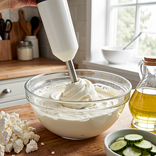 Przełóż twaróg do dużej miski. Jeśli chcesz całkowicie gładkiej pasty, użyj blendera ręcznego; jeśli akceptujesz lekką strukturę, przygotuj widelec lub tłuczek do ziemniaków. Dodaj śmietanę i olej rzepakowy. Rozgnieć i wymieszaj energicznie widelcem lub zmiksuj blenderem przez 20–30 sekund, aż masa stanie się kremowa i jednolita.