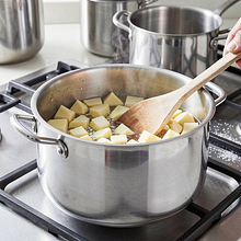 W tym samym garnku lekko osol wodę. Włóż pokrojone ziemniaki i gotuj je 6–8 minut od momentu zagotowania — mają być prawie miękkie, ale nadal jędrne (sprawdź widelcem: mały opór przy nakłuciu). Odcedź i odstaw na sitku, aby pozbyć się nadmiaru wody.