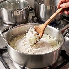 Do cebuli dodaj mąkę i mieszaj energicznie drewnianą łyżką przez 1 minutę — mąka straci surowy smak. Stopniowo wlewaj ciepłe mleko, najpierw 50 ml, energicznie mieszając żeby nie było grudek, potem resztę mleka i śmietanę. Gotuj na małym ogniu 3–5 minut, aż sos zgęstnieje i zacznie obtaczać łyżkę.