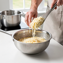 Zdejmij sos z ognia na minutę, dodaj 100 g startego sera i mieszaj do rozpuszczenia. W miseczce roztrzep jajka. Weź 2 łyżki gorącego sosu i powoli wlej do jajek, energicznie mieszając (temperowanie), a następnie wlej mieszankę jajeczną z powrotem do garnka, cały czas mieszając. Dopraw solą, pieprzem i drobno startą gałką muszkatołową (jeśli używasz). Sos powinien mieć gęstą, ale płynną konsystencję.