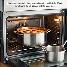 Wstaw zapiekankę do nagrzanego piekarnika i piecz 30–40 minut aż wierzch będzie złocisty, a sos będzie bulgotać przy brzegach. Jeśli wierzch szybko się rumieni, przykryj folią aluminiową na ostatnie 10–15 minut. Po wyjęciu odstaw 10 minut, aby sos lekko stężał i ułatwił krojenie.
