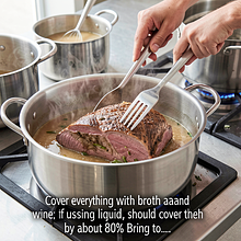 Zalej wszystko bulionem (i winem, jeśli używasz). Płyn powinien przykrywać mięso w około 80%. Doprowadź do wrzenia, następnie zmniejsz ogień do bardzo małego - gulasz ma tylko lekko migotać. Przykryj częściowo pokrywką i duś 1,5-2 godziny, aż mięso będzie bardzo miękkie i da się łatwo pruć widelcem.