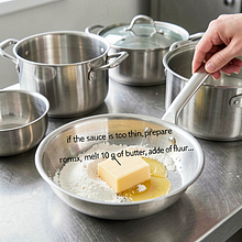 Spróbuj sosu i dopraw solą oraz pieprzem. Dopraw stopniowo — smak się podbije po kilku minutach. Jeśli sos jest zbyt kwaśny, dodaj 1 łyżeczkę cukru lub 10 g masła.