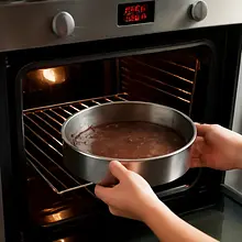 Wstaw formę do nagrzanego piekarnika na środkową półkę i piecz przez 35–45 minut w 175°C. Po 35 minutach zrób test patyczkiem — włóż patyczek do środka ciasta; powinien wyjść z kilkoma wilgotnymi okruszkami, ale nie z surowym, lepkim ciastem.
