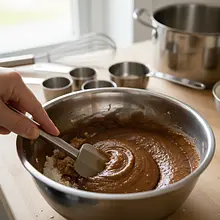 W średnim rondelku z grubym dnem umieść masło, cukier trzcinowy, melasę i miód. Podgrzewaj na małej mocy palnika, ciągle mieszając drewnianą łyżką, aż wszystkie składniki się rozpuszczą i połączą w gładką, lśniącą, ciemną masę. Nie doprowadzaj do wrzenia. Zdejmij rondelek z ognia i odstaw na 10-15 minut, aby masa lekko przestygła. Powinna być ciepła, ale nie gorąca.