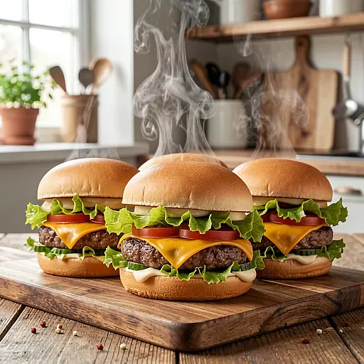 Soczyste burgery wołowe z topionym serem, świeżą sałatą lodową i klasycznym sosem majonezowo-musztardowym w bułce maślanej — nowoczesna wersja polskiego comfort food. Danie łączy dobrze doprawioną, prostą wołowinę z chrupiącą sałatą i dojrzałym pomidorem; ser dodaje kremowości, a delikatny sos podkreśla smak mięsa. Idealne na obiad rodzinny lub nieformalne spotkanie. Podaj z sezonowymi dodatkami (np. kiszony ogórek) oraz kaszą pęczak jako alternatywny dodatek zamiast frytek.