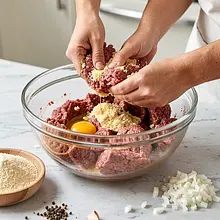 Umieść wołowinę mieloną w dużej misce. Dodaj jajko, bułkę tartą, drobno posiekaną cebulę i czosnek. Dodaj sól i pieprz. Rękoma (luźno) wyrabiaj masę przez około 1–2 minuty, aż składniki będą równomiernie połączone — masa powinna być lepka, ale nie płynna.