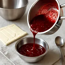 Przełóż dżem malinowy do małej miseczki. Podgrzej go krótko w mikrofalówce (10–15 sekund) lub w rondelku na małym ogniu, mieszając, aż stanie się luźniejszy — nie dopuszczaj do wrzenia. Jeśli używasz proszku z malin liofilizowanych, wymieszaj go teraz z dżemem, aby wzmocnić kolor i smak. Gotowy dżem powinien być płynny na tyle, by dało się go cienko rozsmarować, ale nie spływać z ciasta.
