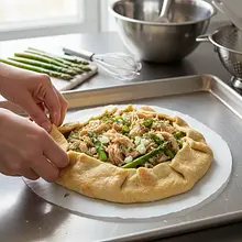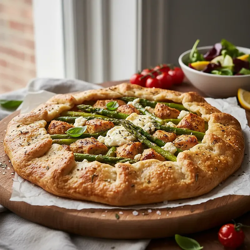 Ta wytrawna galette to kwintesencja wiosennej elegancji w rustykalnym wydaniu. Jest to rodzaj otwartej, swobodnie formowanej tarty na kruchym, maślanym spodzie, która nie wymaga specjalistycznej formy do pieczenia. Jej nieregularny kształt to jej największy urok. Wypełniona jest soczystymi kawałkami kurczaka, delikatnymi, lekko chrupiącymi szparagami i kremowym, wyrazistym w smaku serem kozim, a wszystko to spaja aksamitny sos na bazie crème fraîche. Złocista, chrupiąca skorupka idealnie kontrastuje z bogatym, wilgotnym nadzieniem. Danie jest niezwykle uniwersalne – doskonale smakuje zarówno na ciepło, prosto z pieca, jak i w temperaturze pokojowej, co czyni je idealnym kandydatem na lunch do pracy, elegancką przekąskę na piknik czy lekką kolację w towarzystwie sałatki. Jej wygląd jest równie imponujący co smak, przyciągając wzrok zielenią szparagów i bielą sera na złotym tle ciasta.