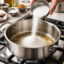 W szerokim rondelku o grubym dnie wsyp 150 g cukru (z 200 g). Ustaw średni ogień i bez mieszania pozwól cukrowi się rozpuszczać — co jakiś czas potrząśnij rondelkiem, aby rozłożyć ciepło równomiernie. Gdy cukier zacznie się topić i nabierać bursztynowej barwy przy brzegach (po około 6–8 minut), delikatnie zamieszaj silikonową szpatułką, aby przemieszać stopione części z nierozpuszczonym cukrem. Uważaj: karmel szybko się przypala, więc obserwuj kolor — ma być złoto‑bursztynowy, nie ciemnobrązowy.